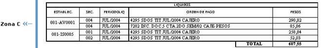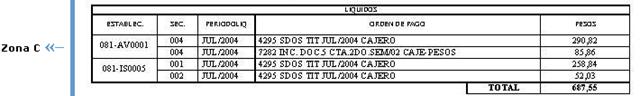 Luego se detallan las liquidaciones por la identificación del establecimiento (Distrito - tipo de organización - numero de establecimiento) ordenadas de menor a mayor y dentro de los establecimientos aparecen las liquidaciones teniendo en cuenta la situación de revista ,Titulares - Provisionales - Suplentes, en este orden y ante la misma situación de revista aparecen por orden de secuencia.