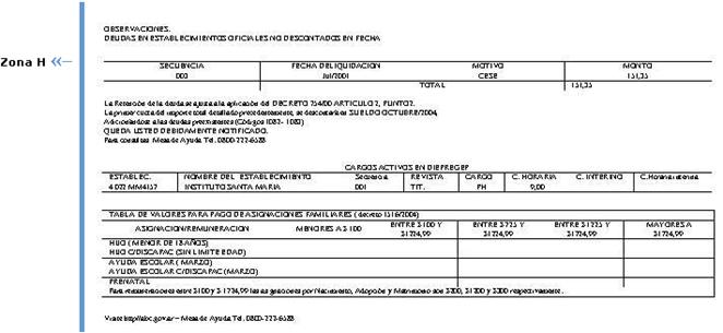 El mismo reemplaza los comprobantes individuales de pago que se entregaban antiguamente, brinda información referente a su relación laboral. Se remite al establecimiento priorizando la situación de revista Titulares - Provisionales - Suplentes, en ese orden; y dentro de ésta en la prestación que se identifique con menor secuencia.